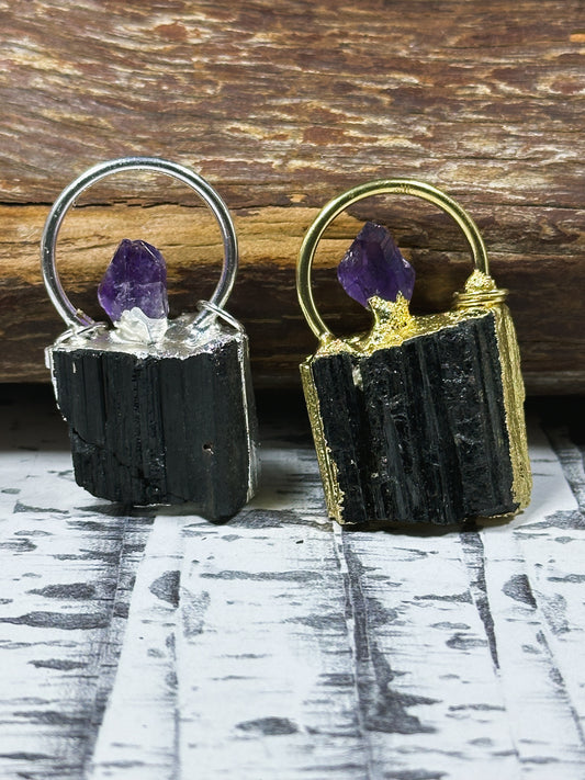 Natural Raw Black Tourmaline with Purple Amethyst Nugget Charm Pendant, Freeform Raw Tourmaline Amethyst Plated Edges Charm Pendant (1pc)