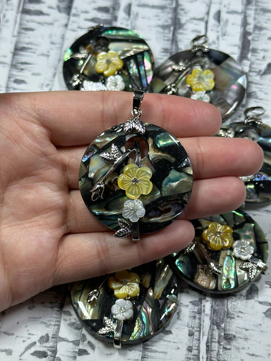 Natural Abalone Shell Pendant Charm, Beautiful Rainbow Abalone Coin Circle Shape Pendant with Floral Flower Design for Jewelry Making (1pc)