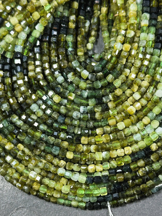 AAA Natural Green Tourmaline Gemstone Bead Faceted 3mm Cube Bead, Beautiful Natural Multi Green Tourmaline Beads Excellent Quality 15.5"