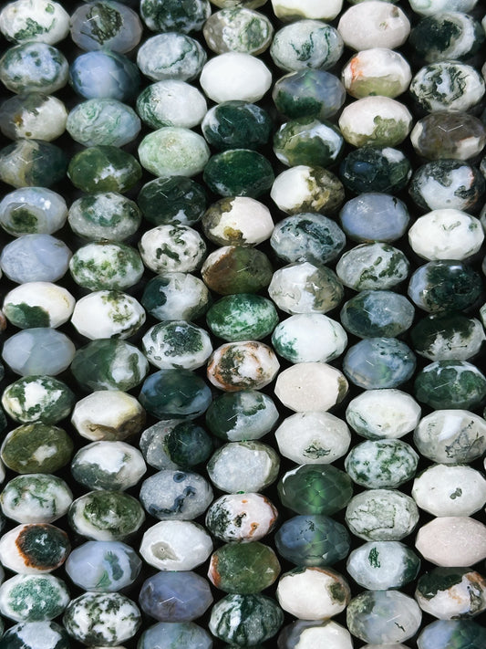 Natural Green Moss Agate Gemstone Bead Faceted Rondelle Shape Beads, Gorgeous Natural White Green Color Moss Agate Beads Full Strand 15.5"