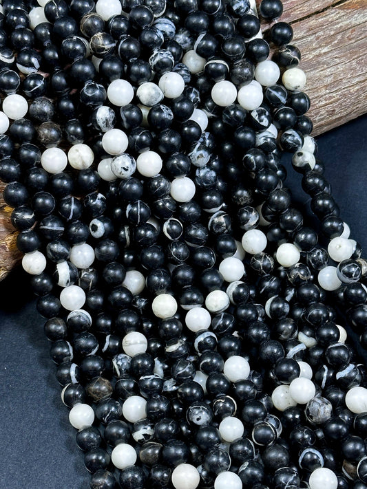 Natural Black White Agate Gemstone Bead 6mm 8mm 10mm Round Beads, Beautiful Black White Color Agate Gemstone Full Strand 15.5"