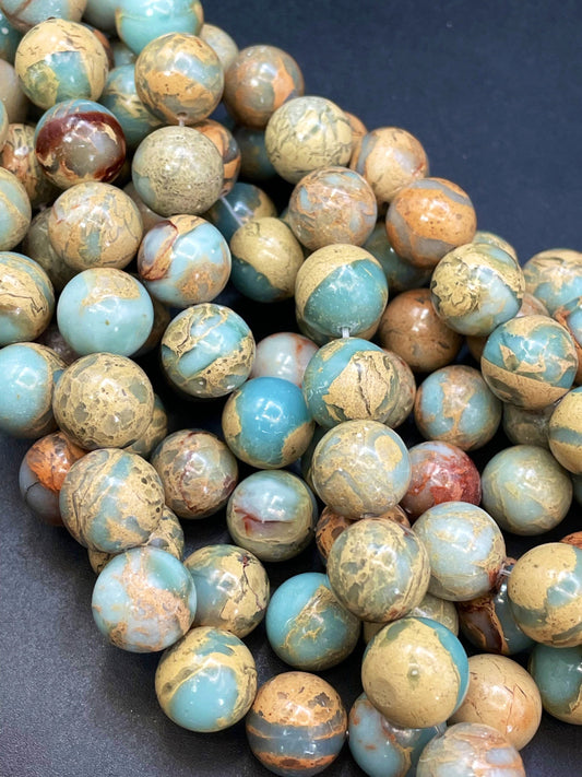 Natural Sea Sediment Jasper Gemstone Bead 6mm 8mm Round Beads, Beautiful Teal Green Beige Color Imperial Jasper Beads Full Strand 15.5"