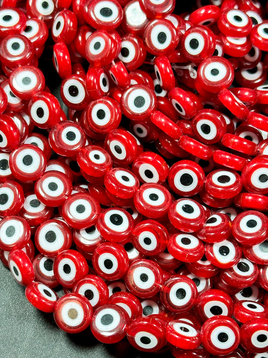 Beautiful Evil Eye Glass Beads 8mm 10mm Flat Coin Shape, Beautiful Dark Red Color Evil Eye Glass Beads, Religious Amulet Prayer Beads