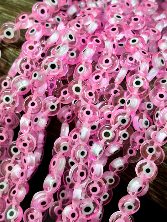 Beautiful Evil Eye Glass Beads 6mm 8mm 10mm Flat Coin Shape, Beautiful Pink Clear Color Evil Eye Glass Beads, Religious Amulet Prayer Beads