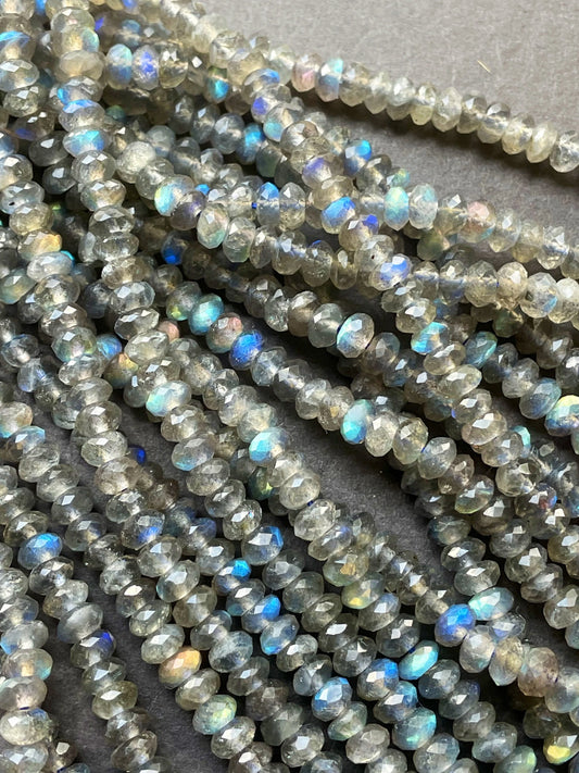 AA Natural blue flash labradorite stone bead . Faceted 3x4mm Rondelle Shape bead. Gorgeous gray color with beautiful blue flash full strand