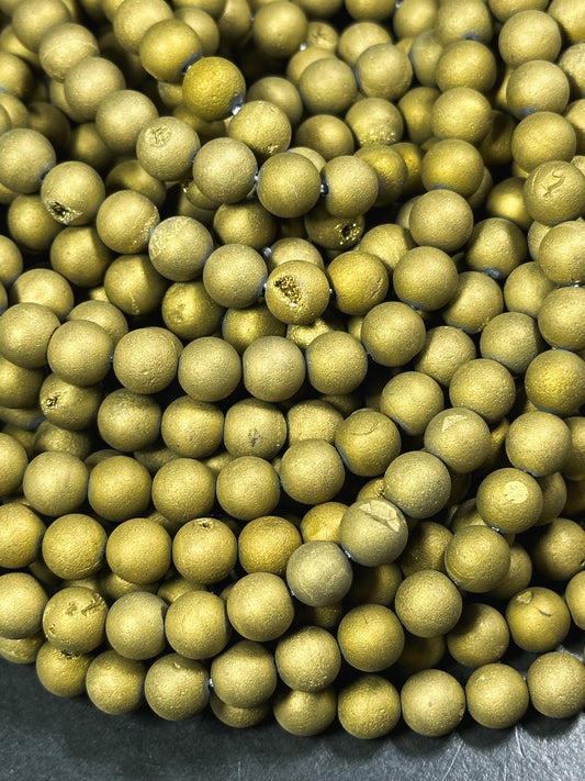Natural Matte Druzy Agate Gemstone Beads 6mm 8mm 10mm 12mm Round Beads, Dark Yellow Brown Color Matte Druzy Agate Beads Full Strand 15.5"