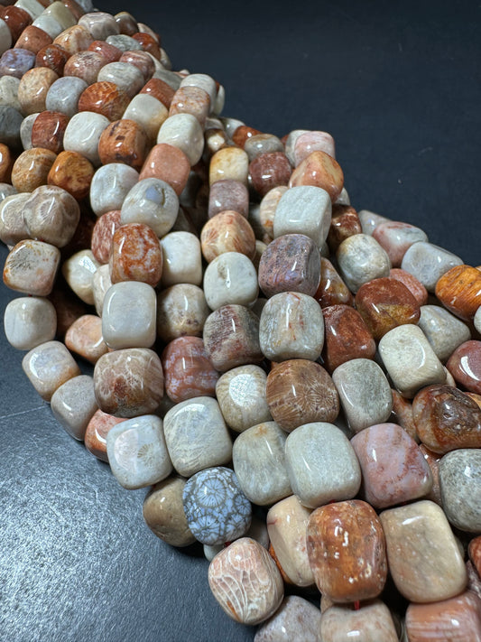 AAA Natural Fossilized Coral Agate Gemstone Beads 11x9mm Cube Shape, Brown Gray Beads, Great Quality Beads, Full length 15.5 inches