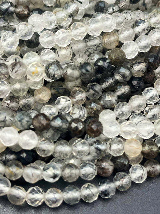 AAA Natural Rutilated Quartz Faceted 5mm Round Bead, Beautiful Black Clear Color Rutilated Quartz Gemstone Beads