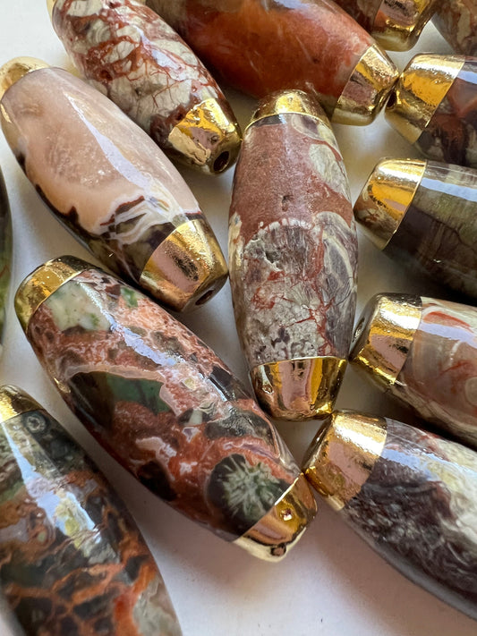 AAA Mushroom Jasper Gemstone Bead. 15x42mm Barrel Shape. Gold Fill Edge. Beautiful Brown Orange Color. Great for Jewelry Making!