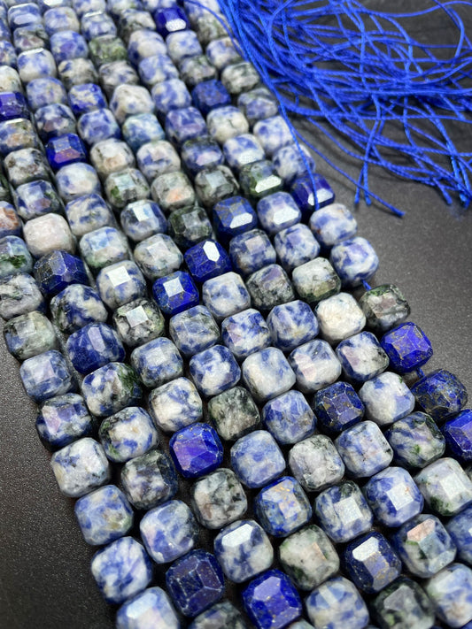 Natural Blue Sodalite Gemstone Bead Faceted 8mm Cube Shape, Beautiful Natural Blue White Color Sodalite Full Strand 15.5"