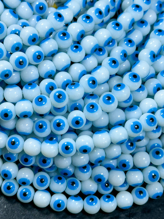 Beautiful Aqua Blue Evil Eye Glass Beads 8mm Round Beads, Beautiful Aqua Blue Clear Evil Eye Amulet Glass Beads, Full Strand Glass Beads