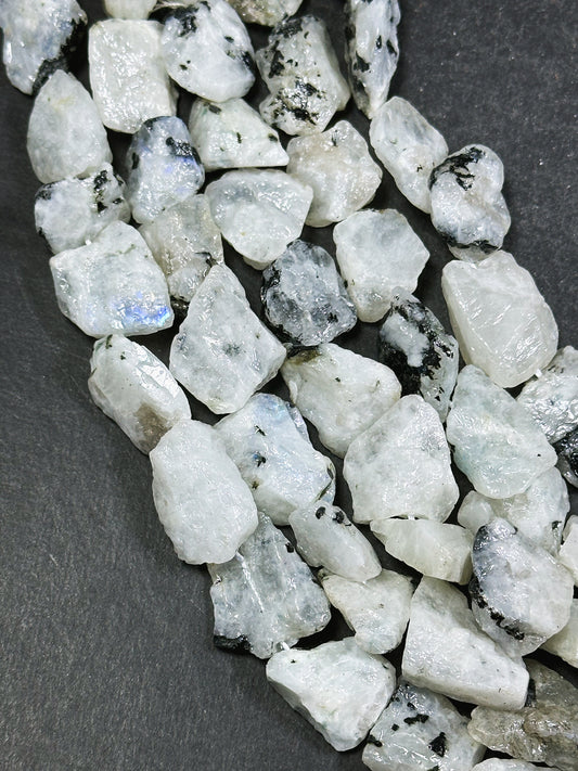 Natural Raw Moonstone Gemstone Bead Freeform Nugget Shape, Beautiful Natural White Moonstone w/ Black Inclusions Stone Bead 15.5" Strand
