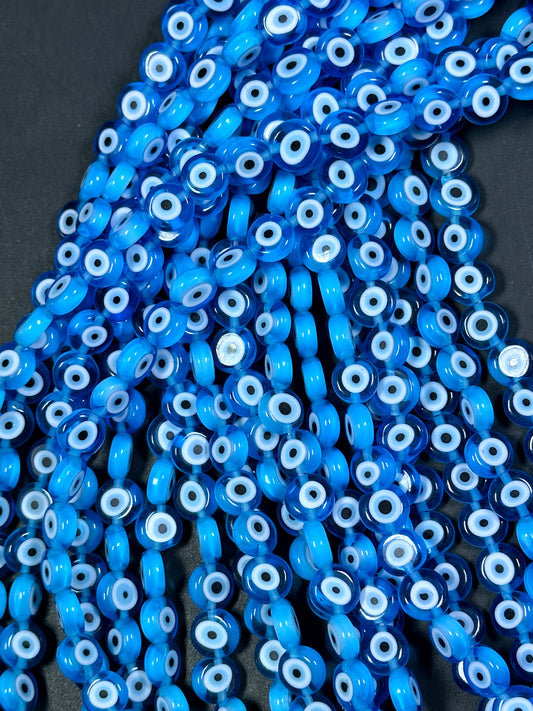 Beautiful Evil Eye Glass Bead 8mm Flat Coin Shape, Beautiful Turquoise Blue w/ Blue Eyes Evil Eye Glass Bead, Religious Amulet Prayer Beads
