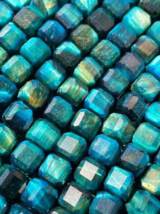 AAA Natural Tiger Eye Gemstone Bead Faceted 8mm Cube Shape, Gorgeous Turquoise Blue Color Tiger Eye Gemstone, Great Quality 15.5"