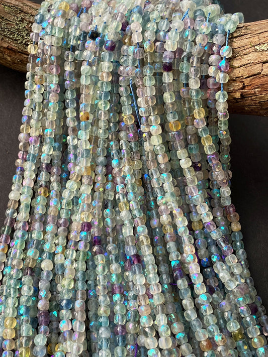 AAA Mystic Natural Fluorite Gemstone Bead Faceted 4mm Cube Shape, Gorgeous Natural Multicolor Purple Green Yellow Fluorite