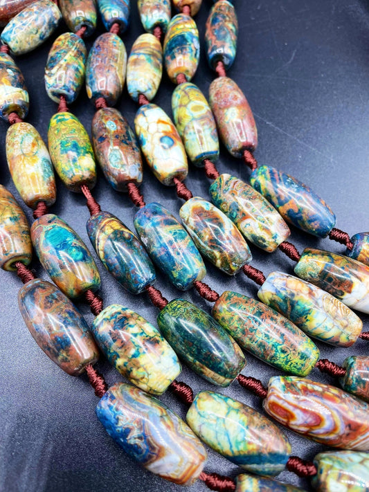 Beautiful natural Tibetan gemstone bead. 12x40mm barrel shape. Beautiful brown blue orange color gemstone. Full strand 15.5”