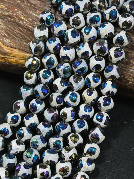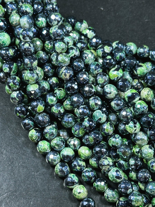 Mystic Natural Tibetan Agate Gemstone Bead Faceted 8mm 10mm Round Beads, Beautiful Mystic Green Black Agate Stone Beads, Full Strand 15.5"