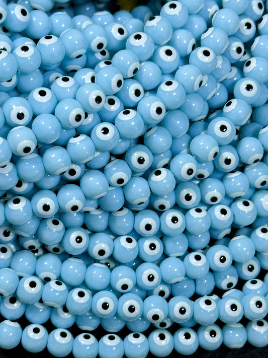 Beautiful Light Blue Evil Eye Glass Beads 6mm 8mm Round Beads, Beautiful Light Blue Evil Eye Amulet Glass Beads, Full Strand Glass Beads