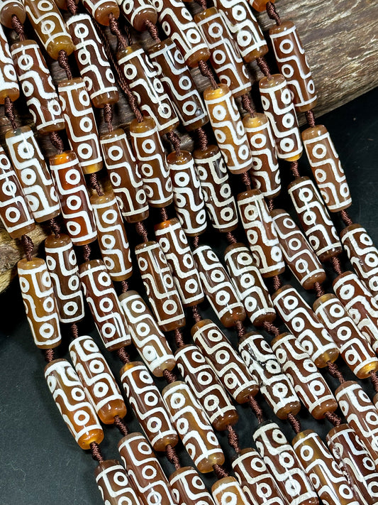 Natural Hand Painted Tibetan Gemstone Bead 30x10mm Tube Shape, Beautiful Brown White Color Tibetan Gemstone Bead Full Strand 15.5"