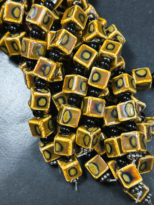 Beautiful Hand Painted Porcelain Beads, 14mm Unique Hand Painted Porcelain Cube Shape Beads, Gorgeous Brown Color Porcelain Bead 8"
