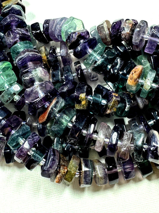 Natural fluorite gemstone beads. Rondelle shape . Gorgeous natural color. Not treated. Excellent quality. Full strand 15.5”