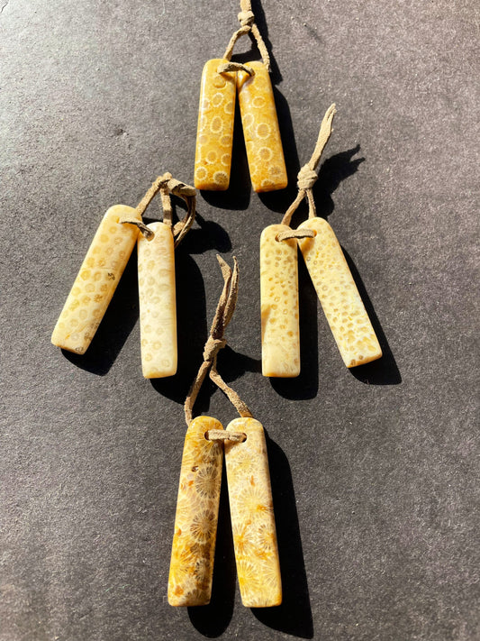 AAA Natural Fossil Coral Stone Earrings 12x50mm Rectangle Shape, Beautiful Natural Beige Color Earrings