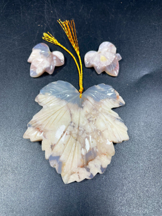 Hand Carved Natural Cherry Blossom Flower Agate Gemstone Earrings 22x25mm Maple Leaf Shape Earrings