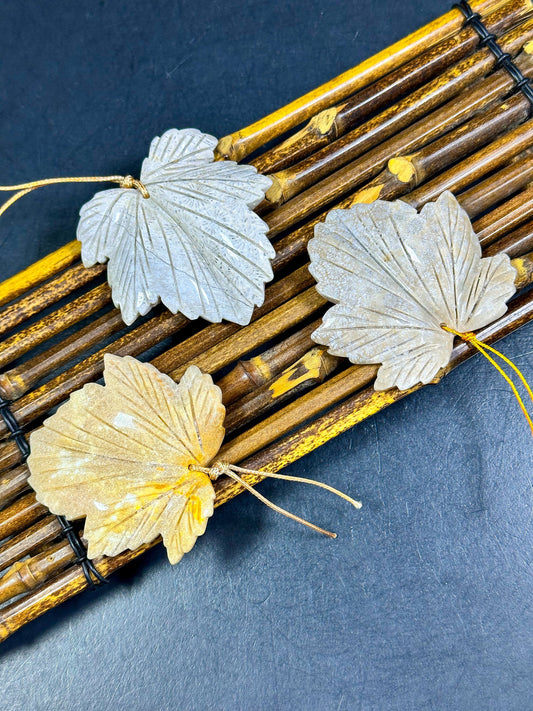 Beautiful Natural Hand Carved Fossil Coral Gemstone Pendant 58mm Maple Leaf Shape, Beautiful Natural Gray Beige Yellow Color Loose Pendant