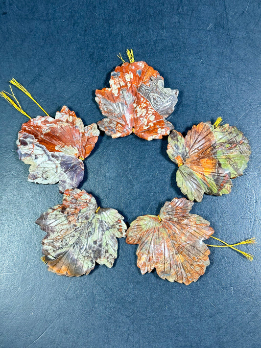 Beautiful Natural Hand Carved Mushroom Jasper Gemstone Pendant 58mm Maple Leaf Shape, Beautiful Red Orange Brown Color Loose Jasper Pendant
