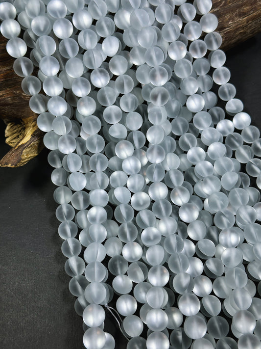 Beautiful Matte Mermaid Glass Beads 6mm 8mm 10mm 12mm Round Beads, Beautiful Matte Clear White Color with Rainbow Flash, Full Strand 15.5"
