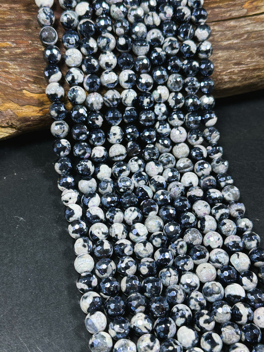 Mystic Natural Tibetan Agate Gemstone Bead Faceted 8mm 10mm Round Beads, Beautiful Mystic White Black Agate Stone Beads, Full Strand 15.5"