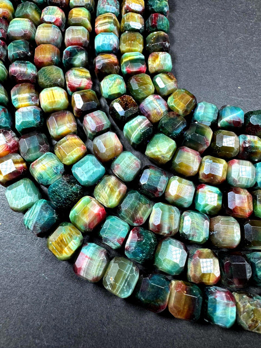 Natural galaxy tiger eye stone bead faceted 9mm cube shape. Beautiful rainbow galaxy color. High quality gemstone bead.