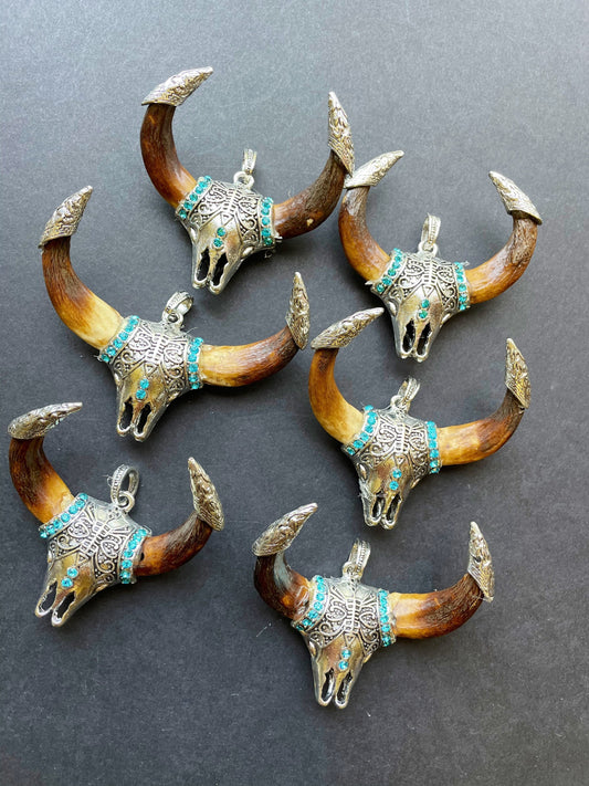 Beautiful Wolf Teeth Pendant, Handmade Long Horn Shape, Gorgeous Brown Color with Silver Plated Teeth Shape Pendant