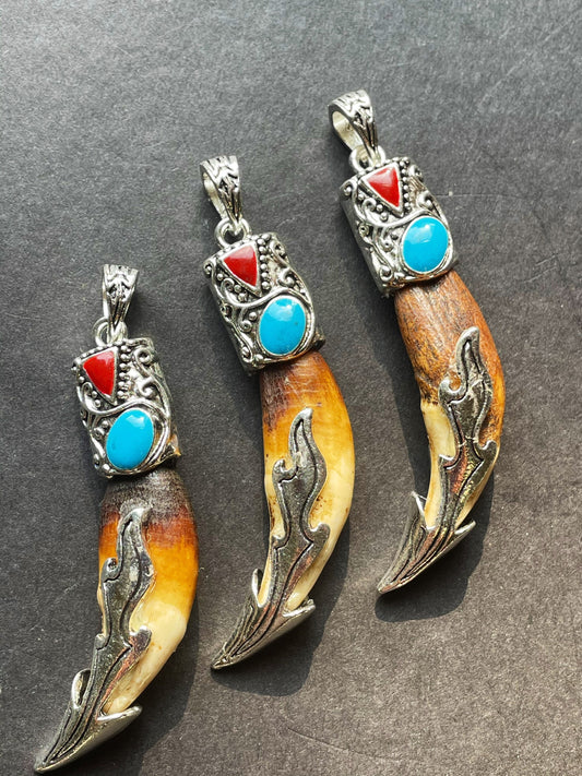 Beautiful Wolf Teeth Pendant 10x45mm Teeth Shape Pendant, Gorgeous Brown Color with Red Blue Beads, Silver Plated Teeth Pendant
