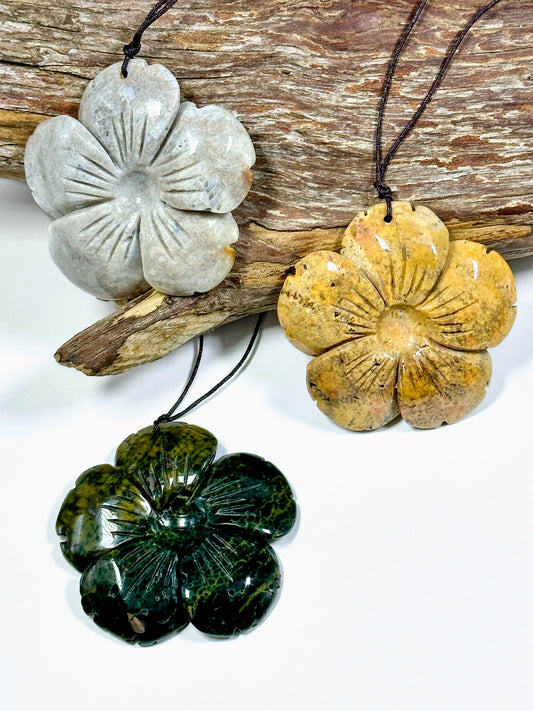 Hand Carved Natural Ocean Jasper Gemstone Pendant 53mm Flower Shape, Beautiful Green White Yellow Color Hand Carved Ocean Jasper Pendant