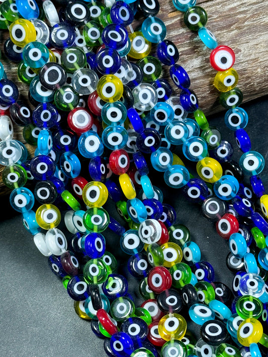 Beautiful Evil Eye Glass Beads 6mm 10mm Flat Coin Shape, Beautiful Multicolor Rainbow Evil Eye Glass Beads, Religious Amulet Prayer Beads