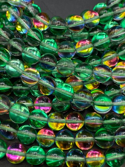 Mermaid Glass Beads, 6mm 8mm 10mm 12mm Round Beads, Beautiful Rainbow Glossy Green Beads, Great Quality Beads, Full Strand 15.5 inch
