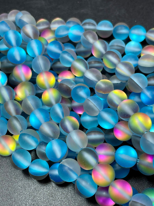Beautiful Matte Mermaid Glass Beads 6mm 8mm 10mm 12mm Round Beads, Beautiful Matte Sea Blue Color with Rainbow Flashes, Full Strand 15.5"
