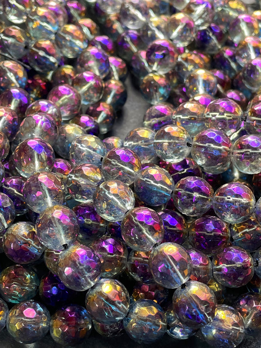 Rainbow Mystic Galaxy Quartz Crystal Gemstone Bead Faceted 6mm 8mm 10mm Round Bead, Gorgeous Purple Clear Rainbow Color Full Strand 15.5"