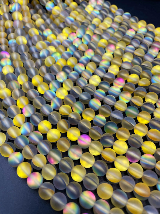Beautiful Matte Rainbow Mermaid Glass Bead 6mm 8mm 10mm 12mm Round Beads, Gorgeous Matte Yellow Rainbow Color Beads Full Strand 15.5"