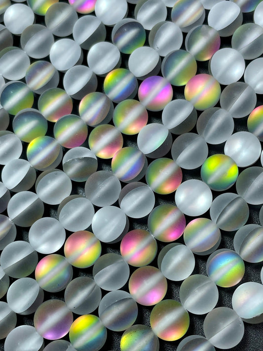 Beautiful Matte Mermaid Glass Beads 6mm 8mm 10mm 12mm Round Beads, Beautiful Matte Clear White Color with Rainbow Flash, Full Strand 15.5"