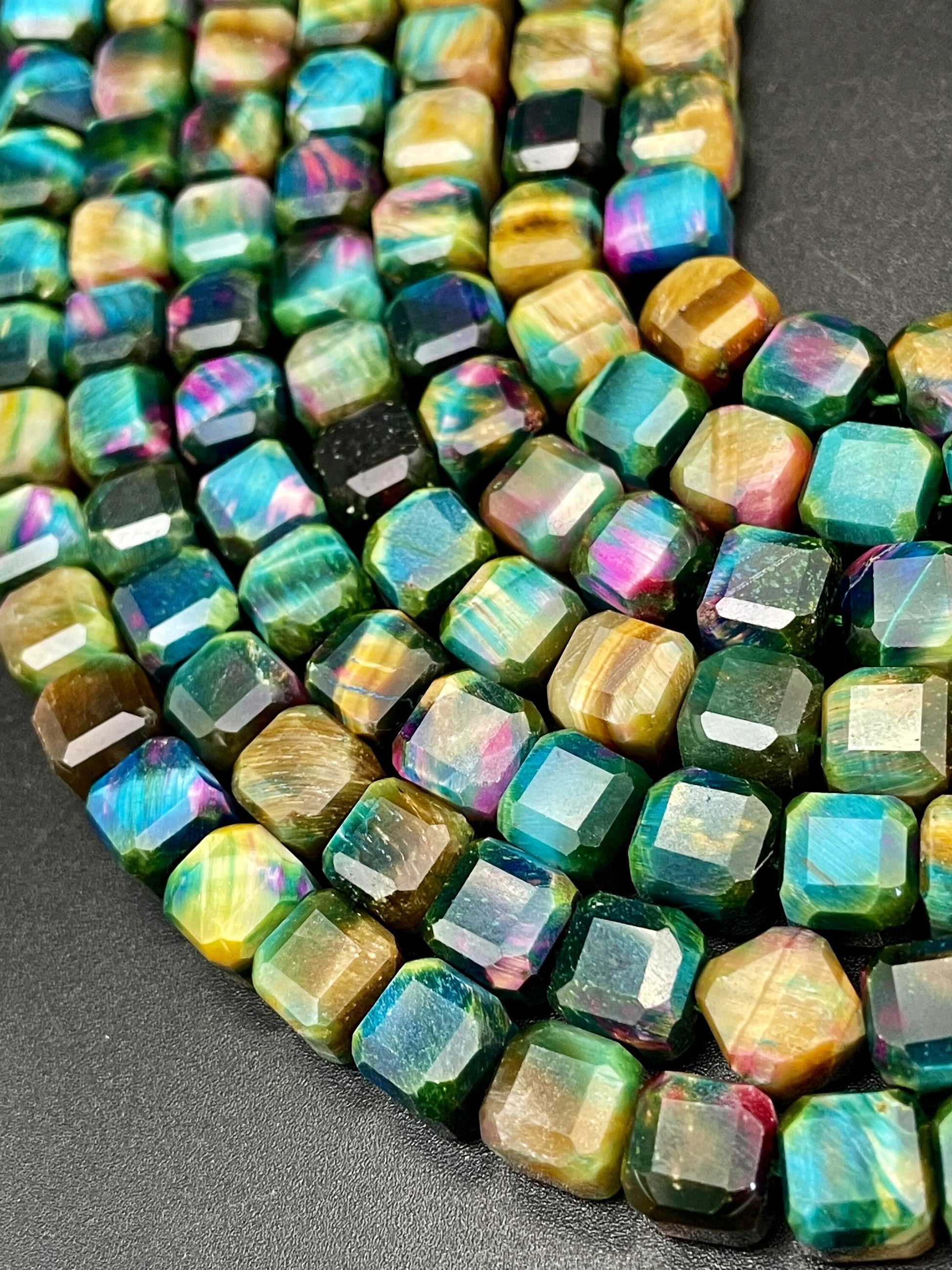 AAA galaxy tiger eye stone bead. Faceted 9mm cube shape bead . Gorgeous green multi color tiger eye gemstone .Unique looking tiger eye bead