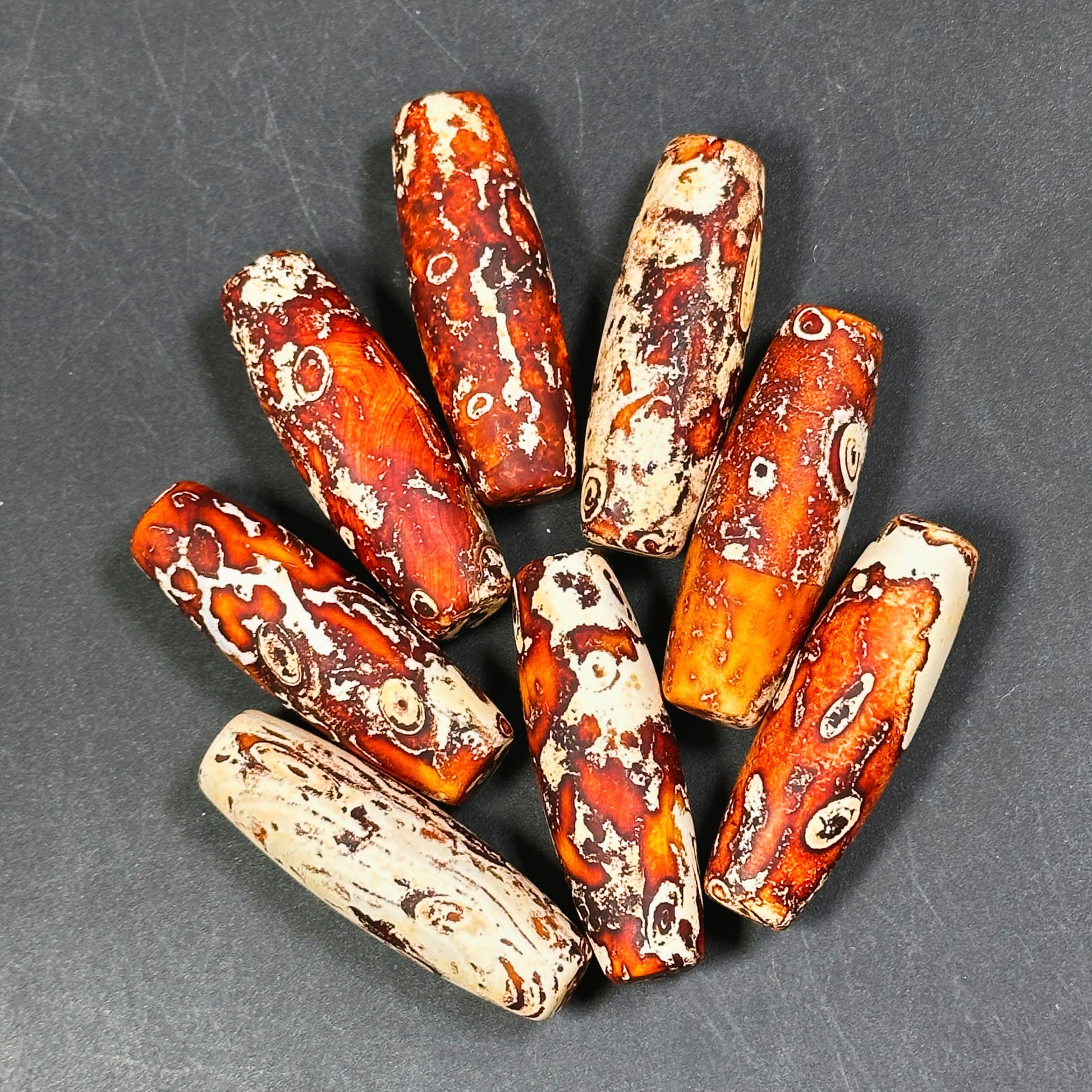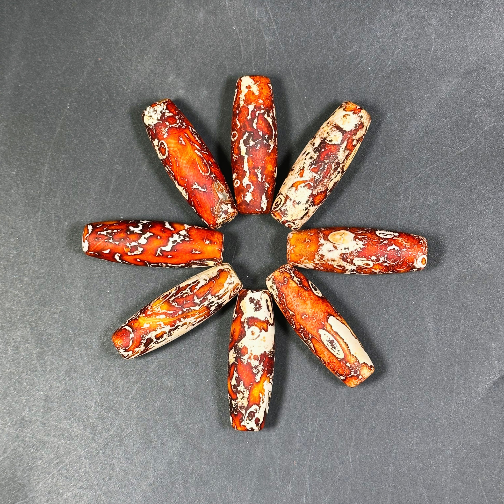 AAA Hand Painted Tibetan Gemstone Bead 39x13mm Barrel Shape Bead, Beautiful Orange Beige Color Unique Design Tibetan Agate LOOSE BEADS