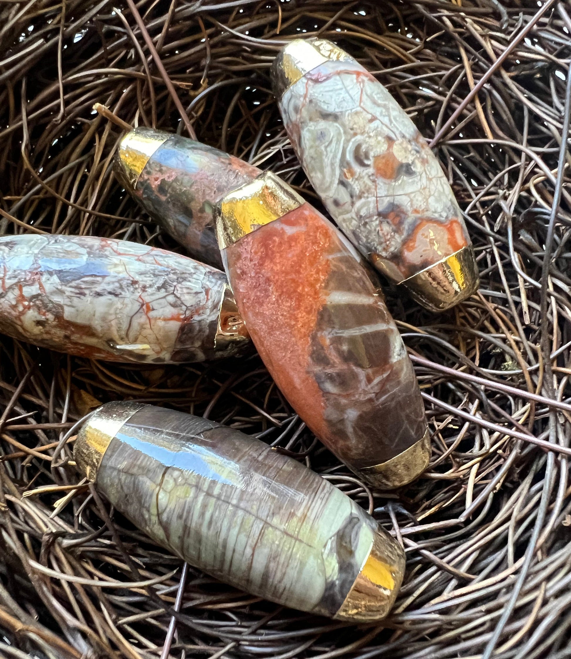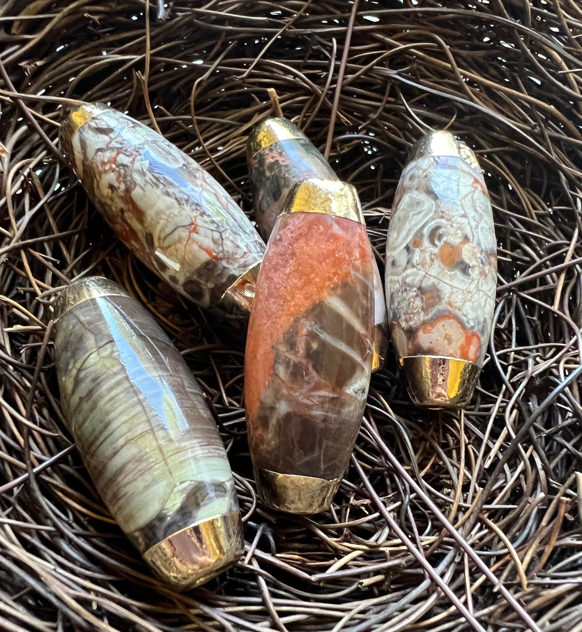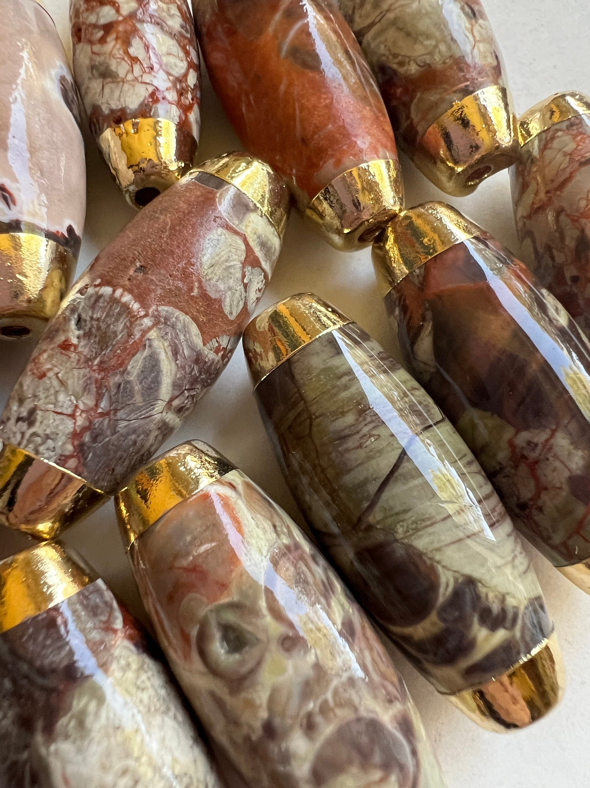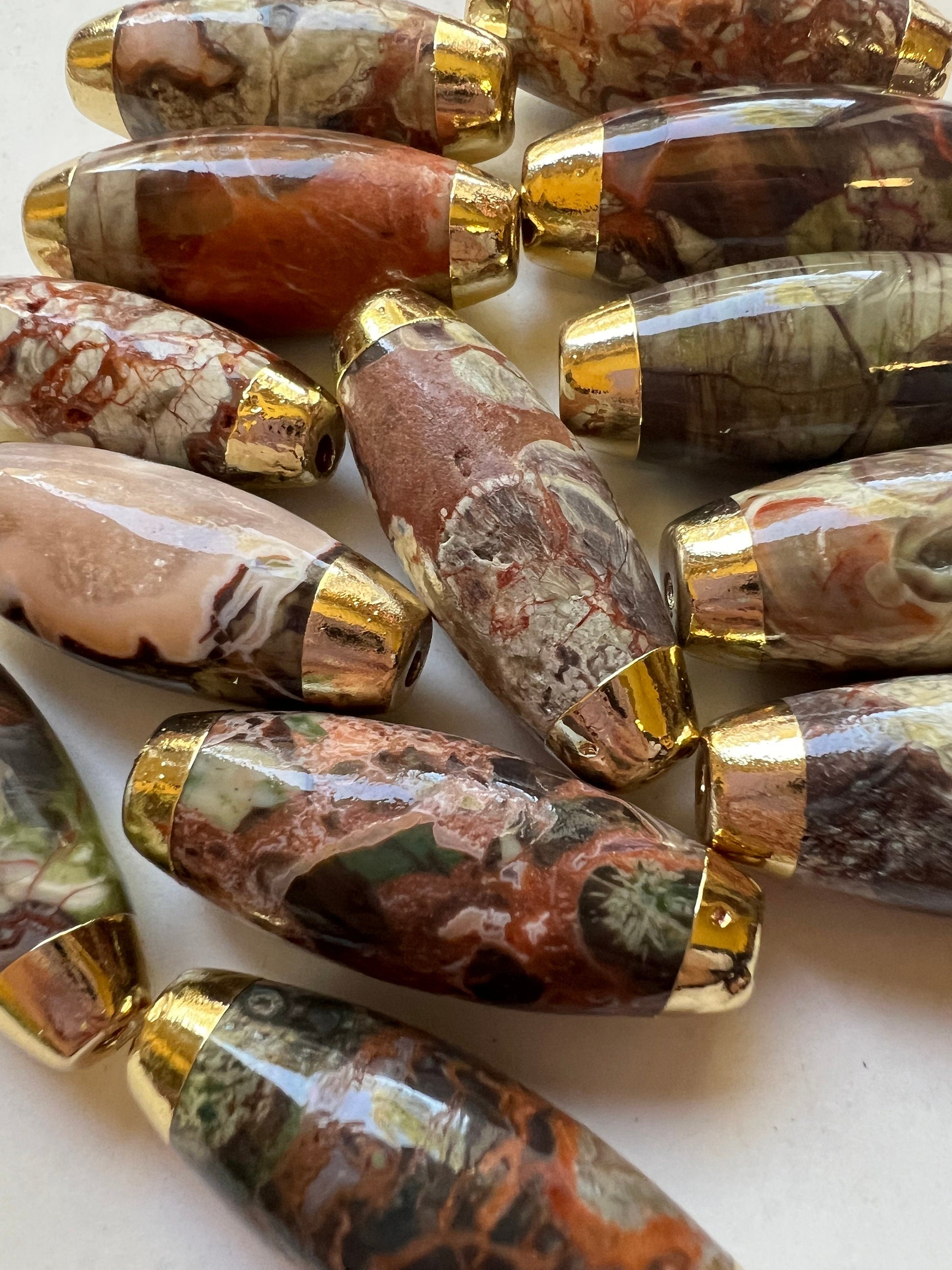 AAA Mushroom Jasper Gemstone Bead. 15x42mm Barrel Shape. Gold Fill Edge. Beautiful Brown Orange Color. Great for Jewelry Making!