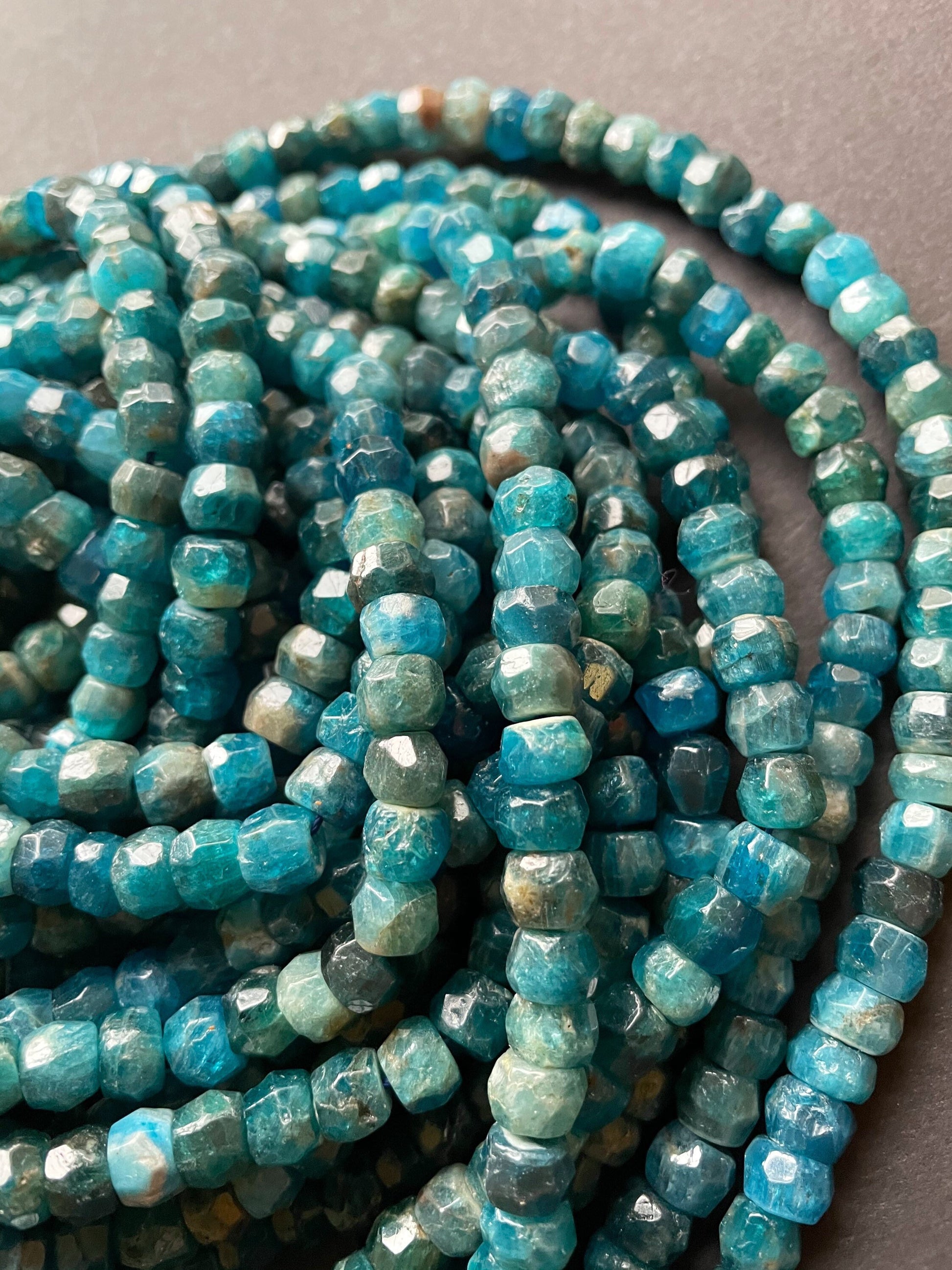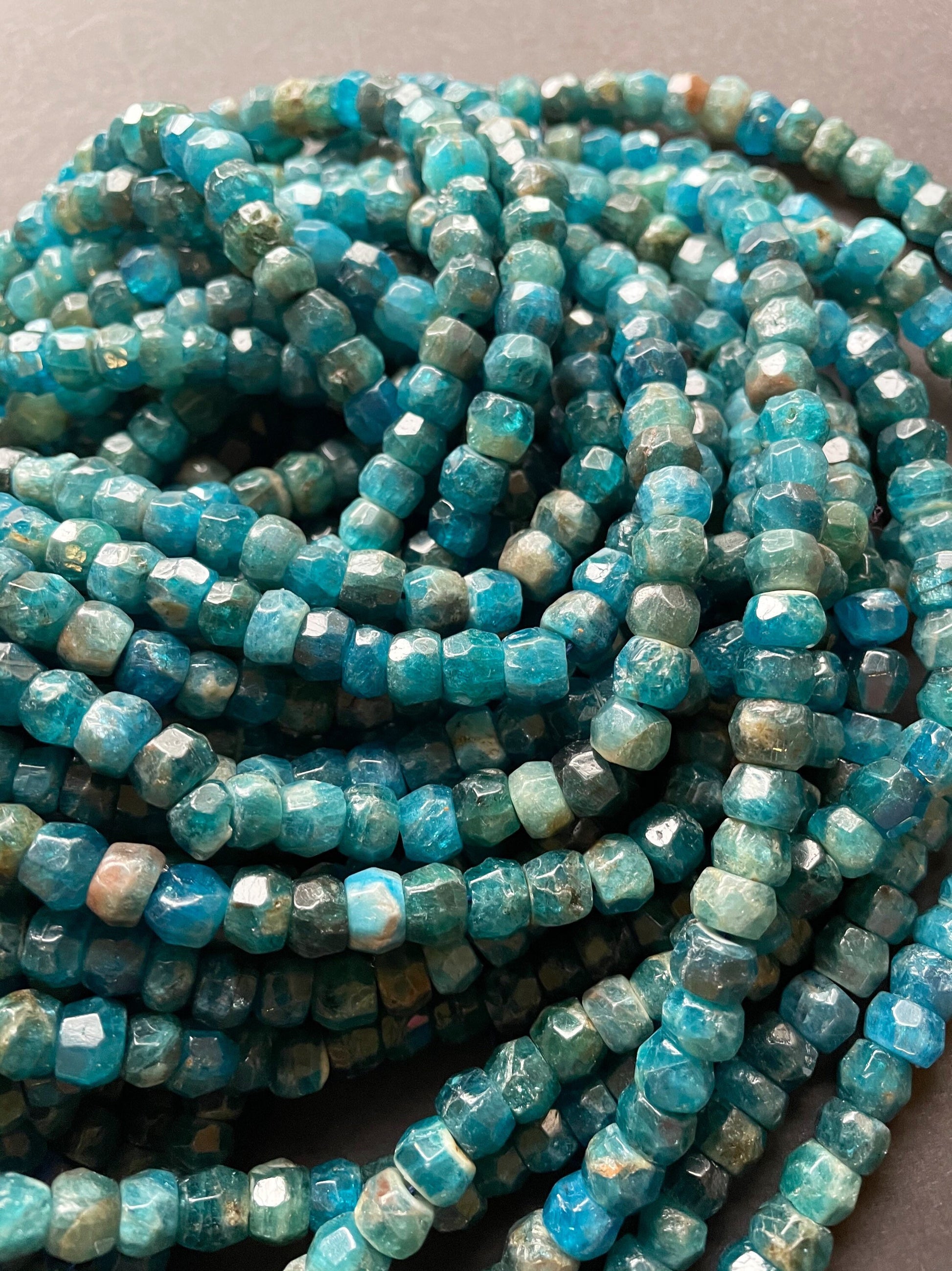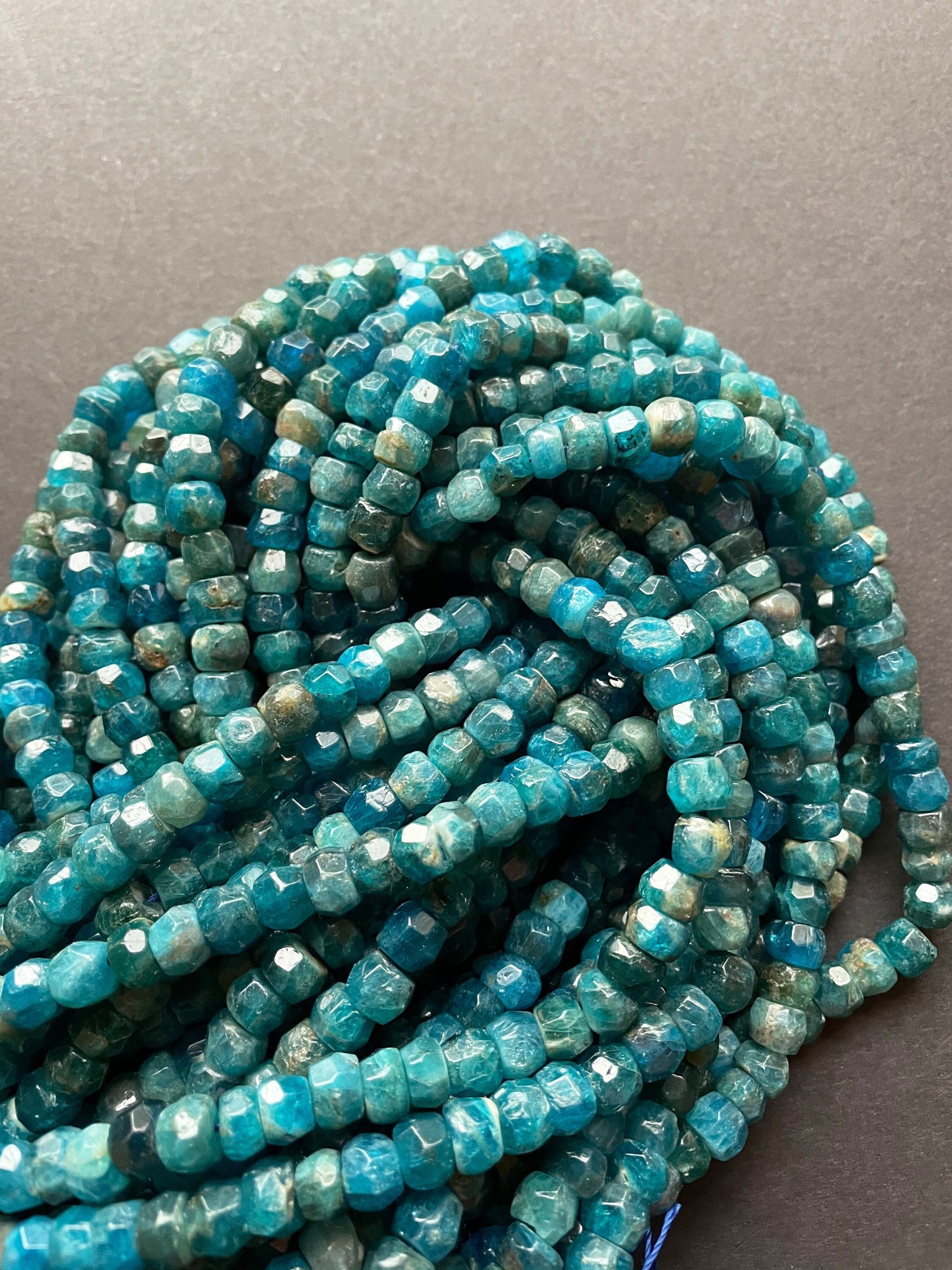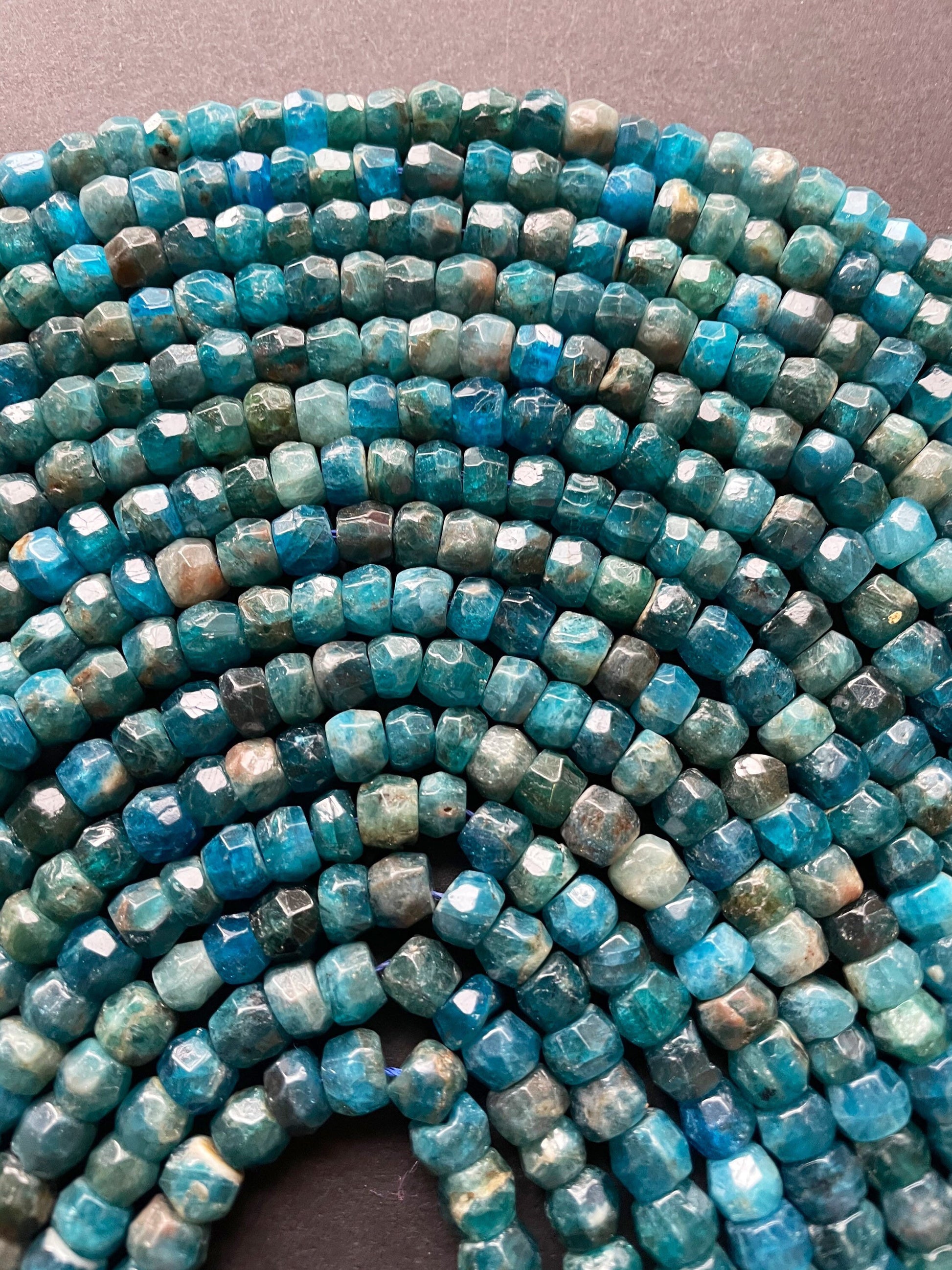 AAA Natural apatite. Faceted Roundell gemstone bead. 5x8mm . Gorgeous sea blue color bead . High quality gemstone bead. 15.5” strand