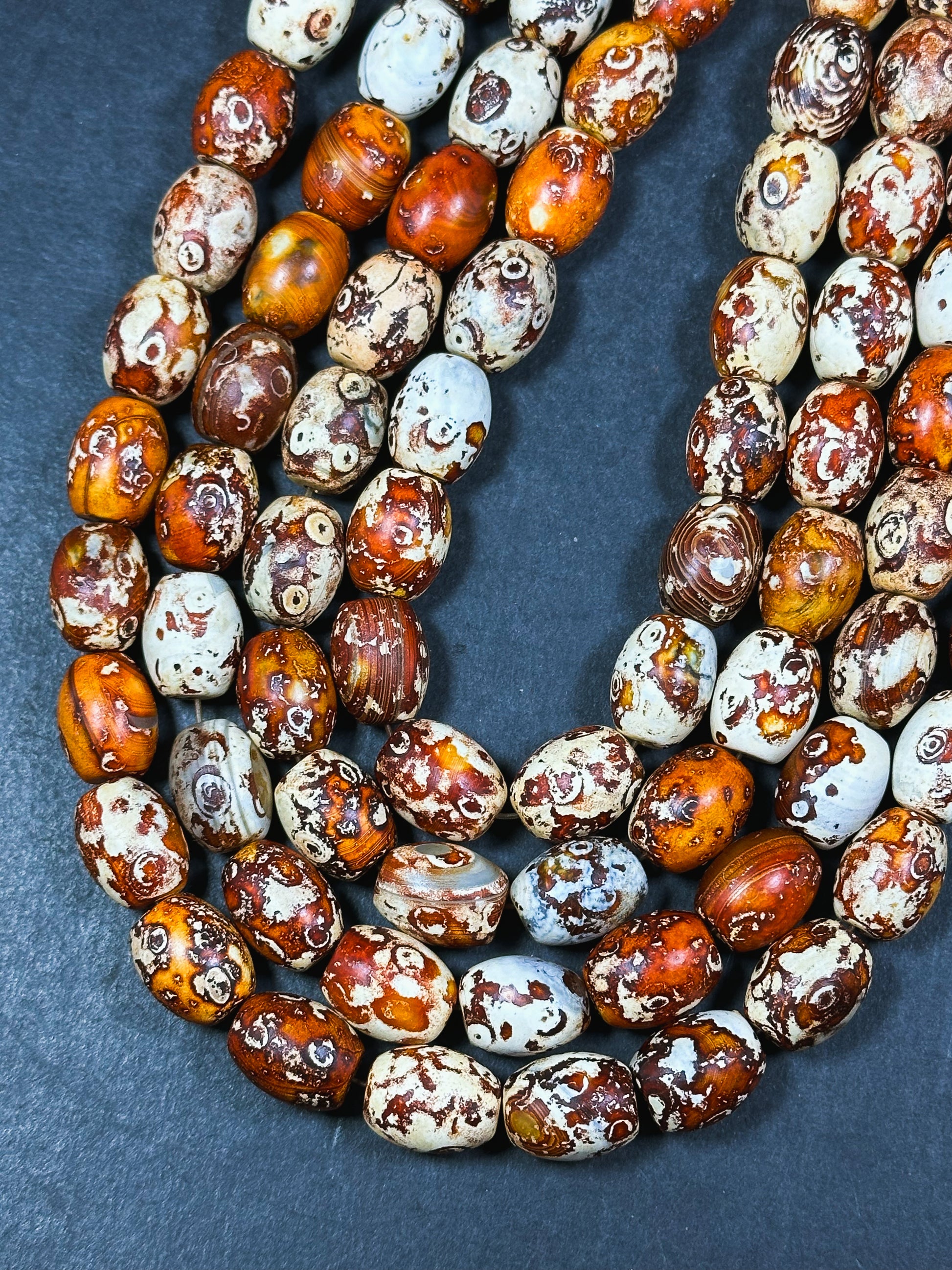 AAA Natural Tibetan Gemstone Bead 12x16mm Barrel Shape, Beautiful Orange Brown Hand Painted Tibetan Stone Bead, Excellent Quality 14" Strand
