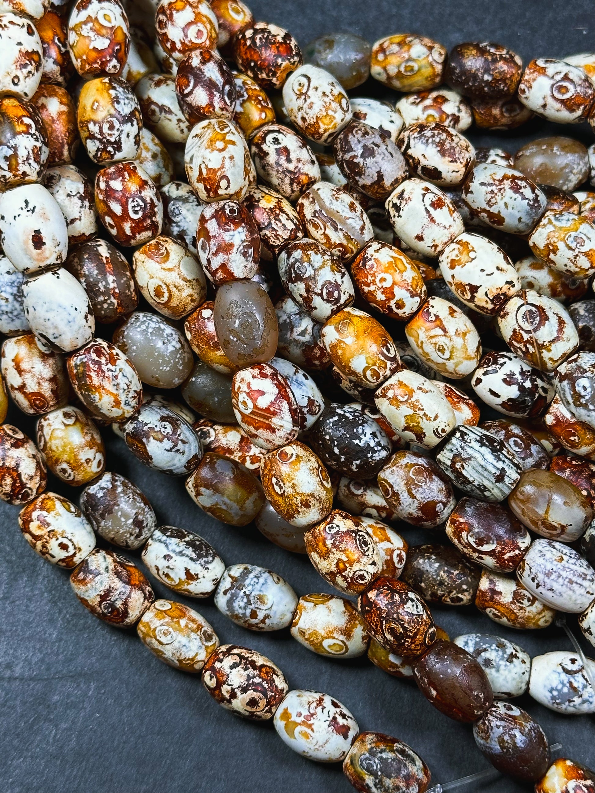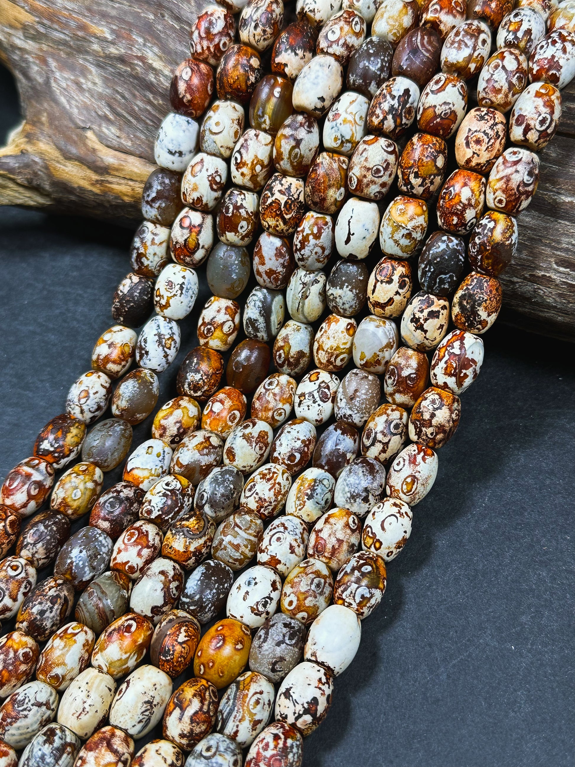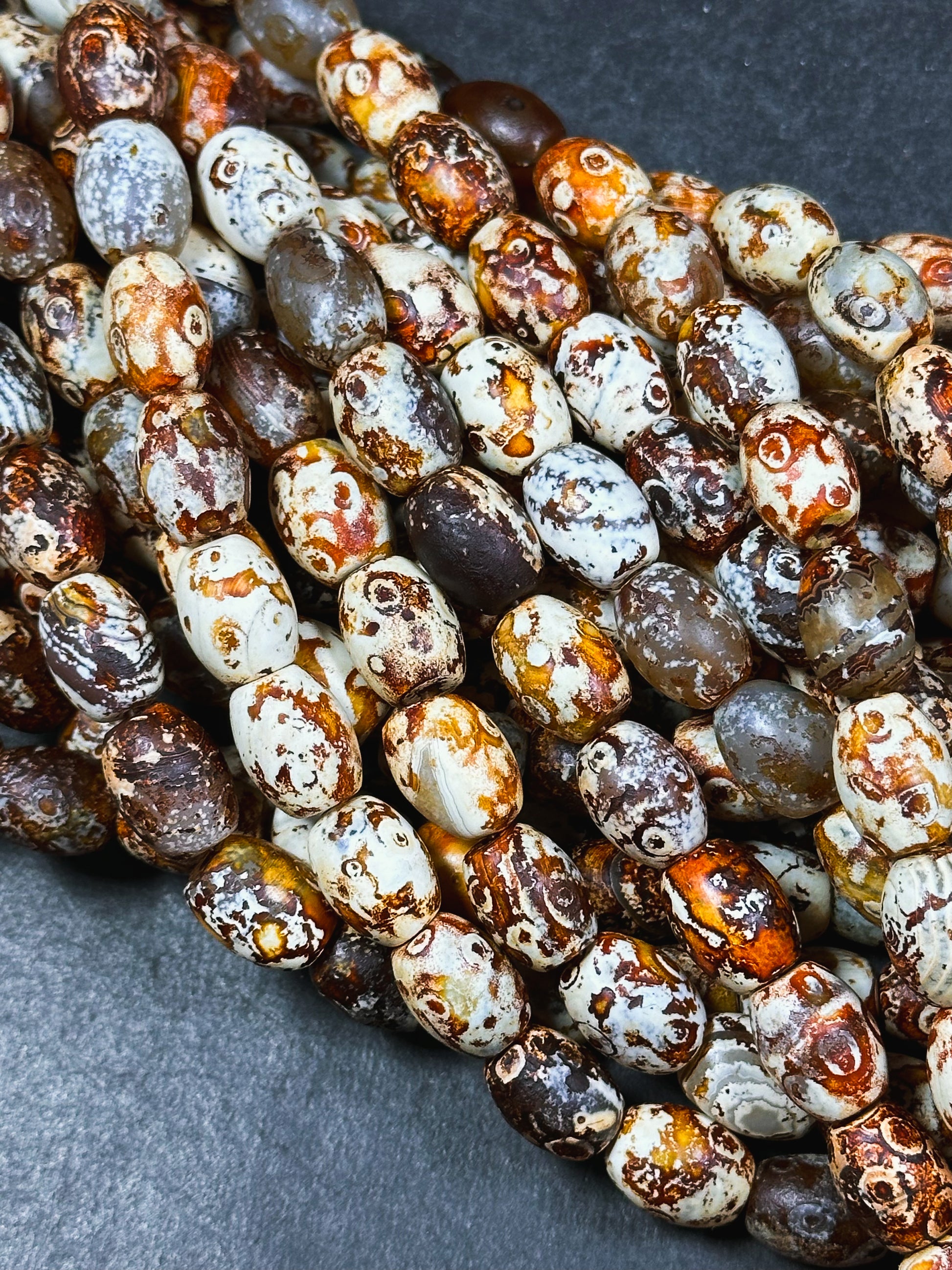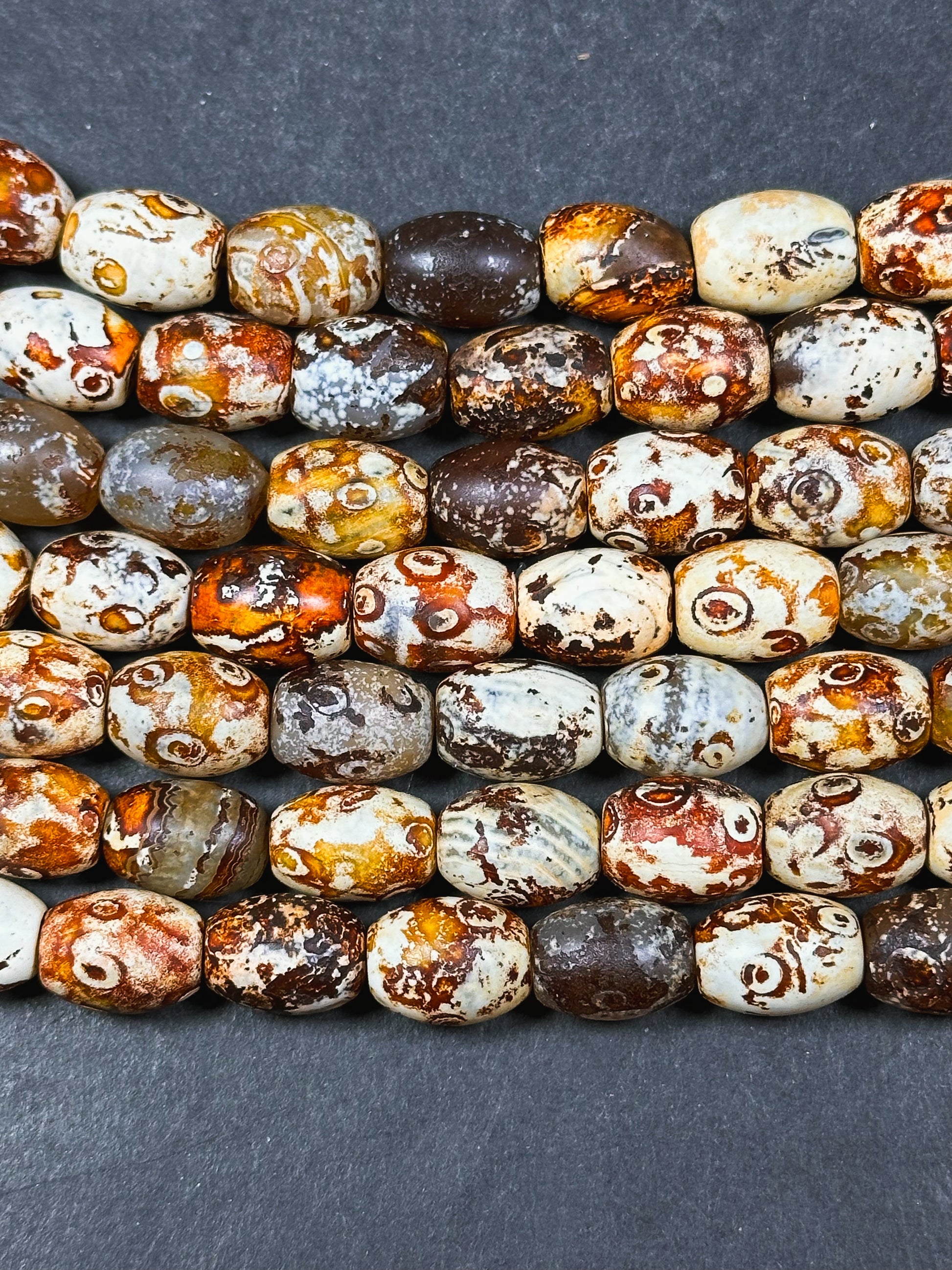 AAA Natural Tibetan Gemstone Bead 13x10mm Barrel Shape, Beautiful Orange Brown Hand Painted Tibetan Stone Bead, Excellent Quality 14" Strand