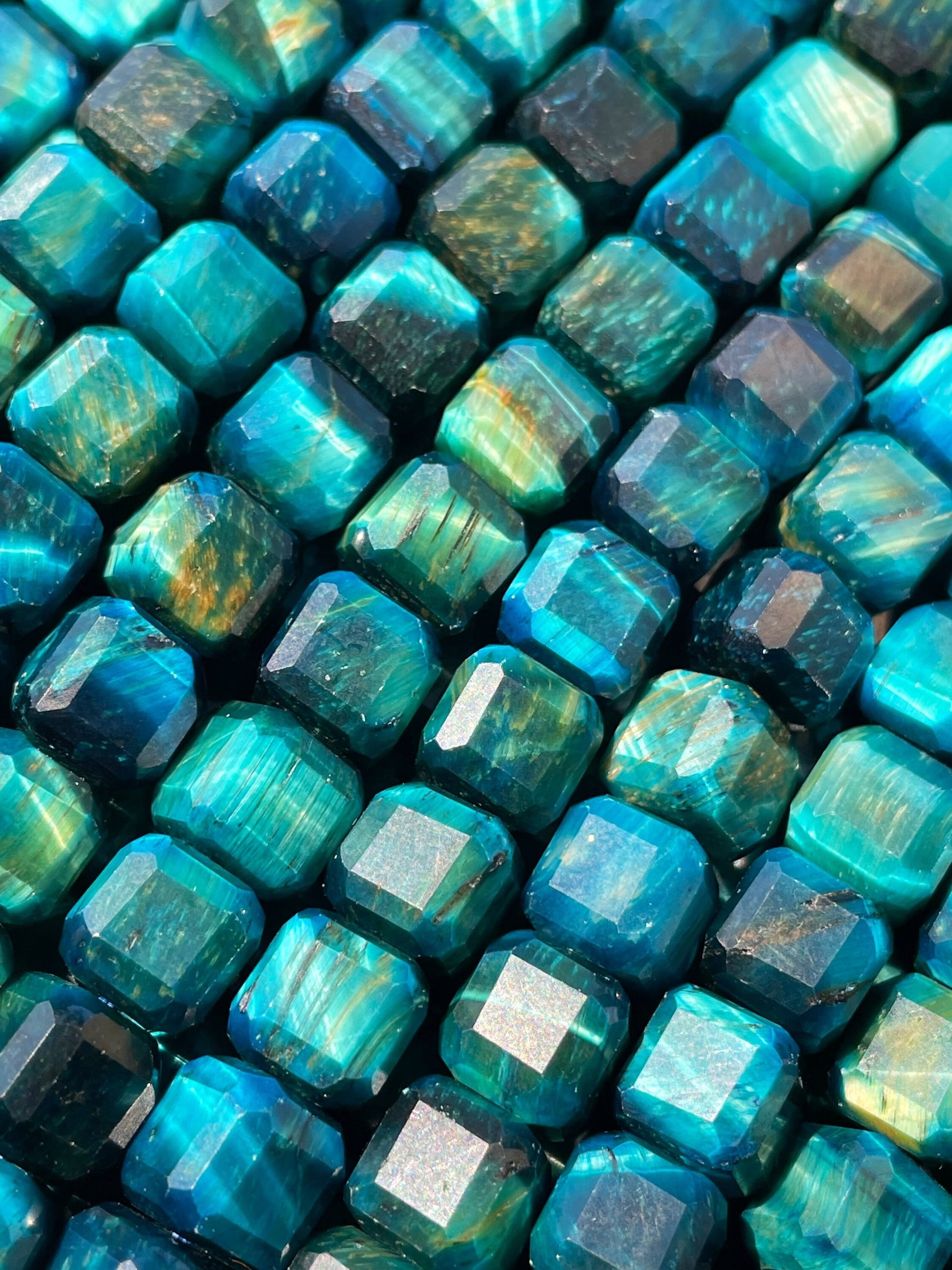 AAA Natural Tiger Eye Gemstone Bead Faceted 8mm Cube Shape, Gorgeous Turquoise Blue Color Tiger Eye Gemstone, Great Quality 15.5"