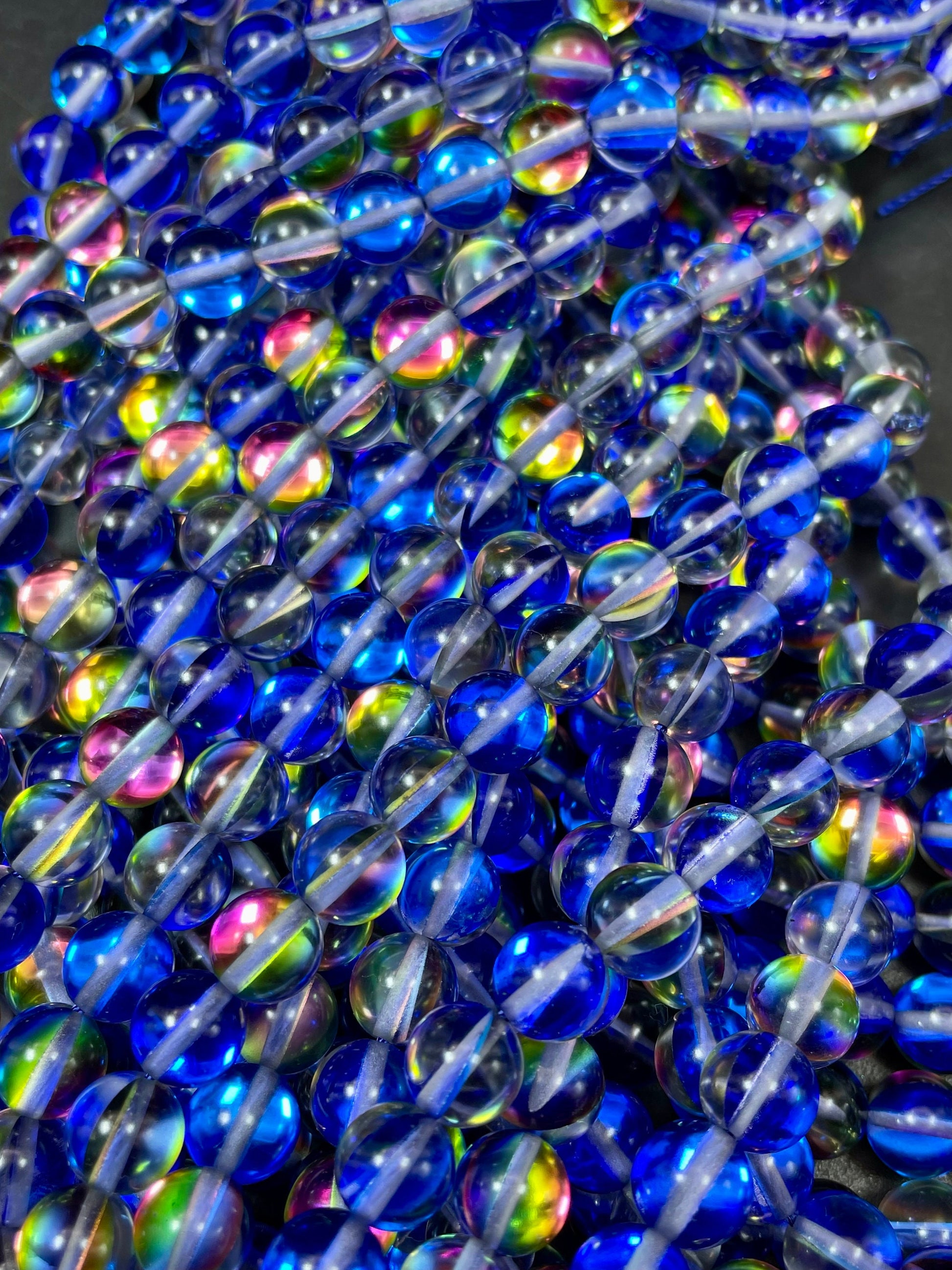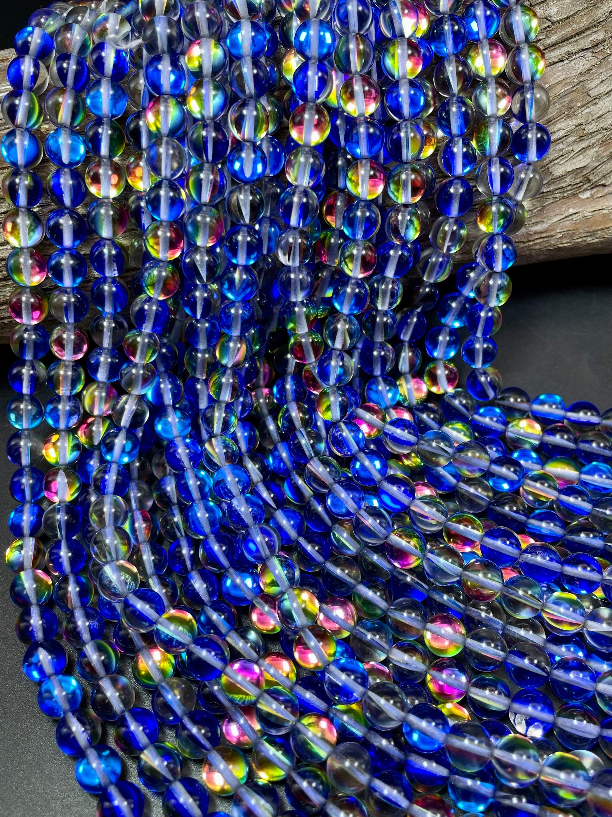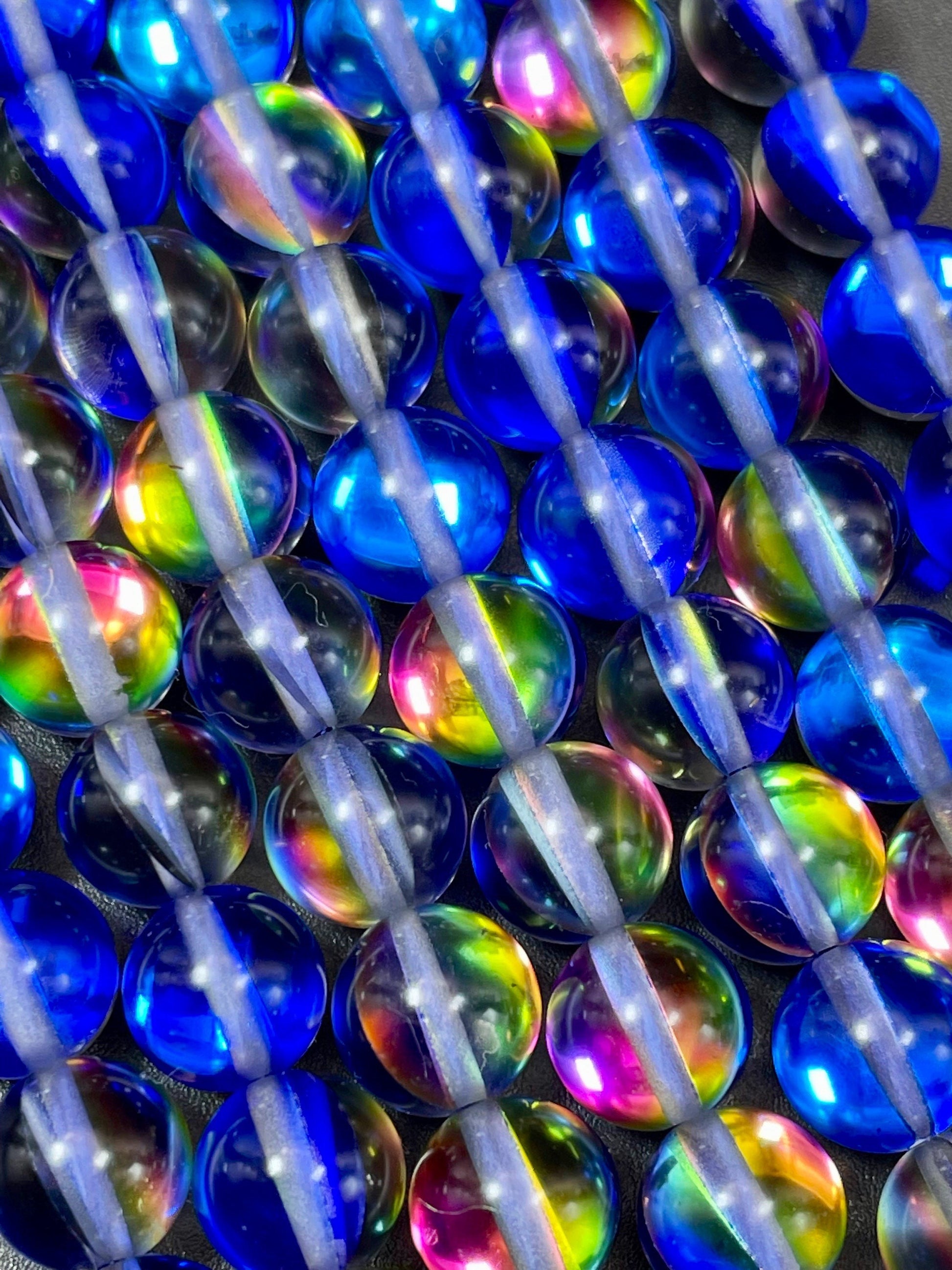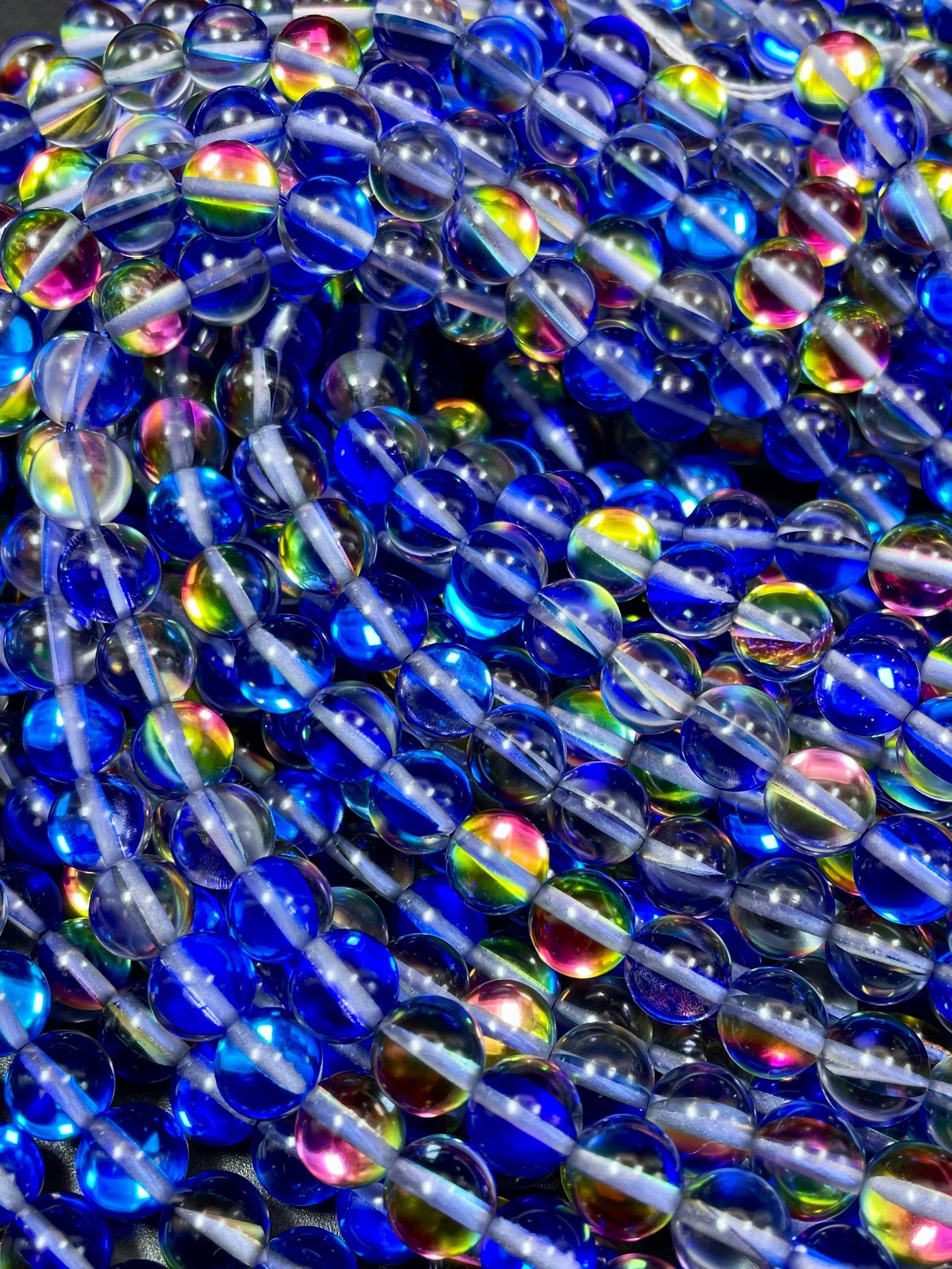 Mermaid Glass Beads 6mm 8mm 10mm 12mm Round Bead, Gorgeous Blue Rainbow Color Mermaid Glass Beads, Full Strand 15.5"