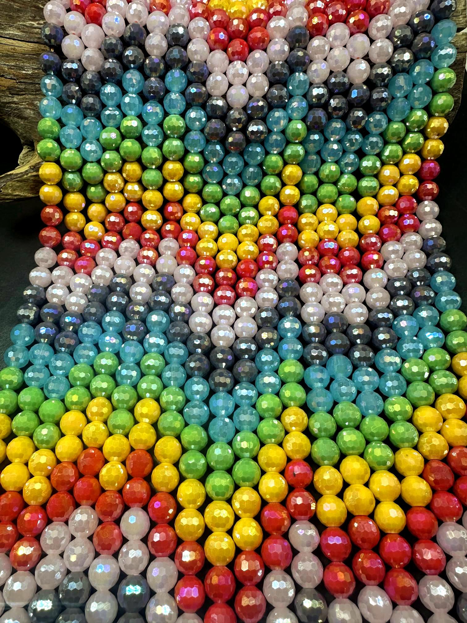 Beautiful Multicolor Rainbow Crystal Glass Bead (Yellow, Green, Blue, Purple, Pink, Red) 10mm Faceted Round Shape Bead. High Quality 15.5"